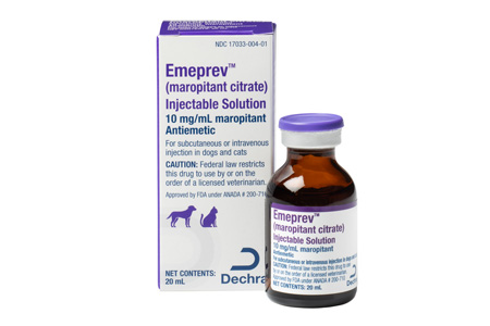 Emeprev™ Injectable Solution is indicated for the prevention and treatment of acute vomiting in dogs and for the treatment of vomiting in cats. Each mL of solution contains 10 mg maropitant (as maropitant citrate), 63 mg sulfobutylether-β-cyclodextrin, 11.1 mg benzyl alcohol (preservative), and water for injection.¹ Emeprev™ is supplied in a 20 mL amber glass vial.