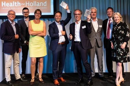 Caption: VarmX's CEO Paul Bilars (middle left) and CSO Prof. Pieter Reitsma (middle right) show the tumbstone for their new €12.5 mln financing at the HollandBIO Dutch Biotech Event this weekend. On their left side from left to right presenter Hans Schikan, René Brama and Gerty Holla (InnvovationQuarter) and to the right, Francis Quint (InnovationQuarter), Elisabeth Schless of Rvo and Colja Laane on behalf of InnovationQuarter.